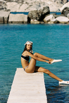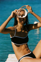 A square-neck bralette with slim adjustable straps and contrast piping that frames the décolletage. The cups are lightly gathered at the base for a natural shape and easy movement. The matching brief sits mid-rise with a gently curved waist and the same crisp trim. Sleek and athletic, made for cliff paths and long swims.