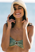 The same ring-gathered bandeau balances shape and support while keeping tan lines minimal. The coordinating brief is a mid-rise classic with high-cut legs to lengthen the silhouette and neatly covered back. The Milos textured knit moves with you and keeps its shape wear after wear.