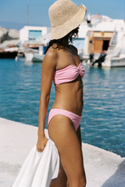 A bandeau top ruched to a neat centre ring gives gentle lift and a clean, strap-free line. The matching brief sits mid rise with a softly curved waist that flatters without digging in. Crafted in our Milos textured knit, the stretch hugs smoothly and dries fast for long days between sea and sun.