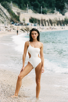 Early light skims the shore, and a clean white curve catches the sun. Lily’s one-shoulder neckline cuts a graceful line across the collarbone, while sculpted side cutouts trace the waist for a long, effortless silhouette. An adjustable shoulder strap lets you find your fit. Smooth, fully lined fabric moves softly against the skin, made for saltwater swims and slow walks home along the French Riviera.