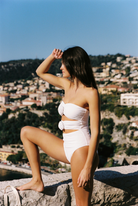 Champagne White mirrors sunlit surf. Midnight Black echoes the harbour after dark. In both shades a three-dimensional rose knot gathers the bandeau while a second bloom cinches the waist. Twin cut-outs leave ribbons of skin, linking a high waist to a leg-lengthening rise. Fine shoulder straps adjust or unclip so you decide: sleek support or a clean, open back.