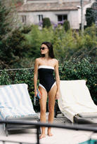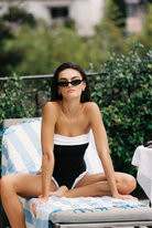 City lights glitter across the bay, you answer with a shoulder-bare column of deep noir, tipped in crisp white. Clean colour blocks carve an effortless hourglass, and a high leg slices the water like midnight glass. Sip, dive, repeat—this is after-dark elegance made for the French Riviera.