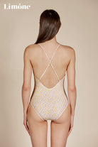 Indulge in luxury with our ultra-soft Lycra fabric featuring a delicate pale yellow daisy print. This design includes slender spaghetti straps and a neckline with an adjustable drawstring for a customizable fit. The front is adorned with a charming bow knot detail, and it comes with padded cups for added comfort and confidence.