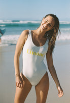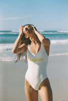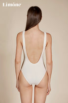 Elevate your swimwear game with our imported Leica fabric in a delicate shade of off-white. This piece features a U-neckline and a strikingly open U-shaped back, exuding both allure and elegance. Adorned with a logo emblem on the chest, this swimsuit boasts a sophisticated touch. Plus, it comes with built-in padded cups for extra support and shaping.